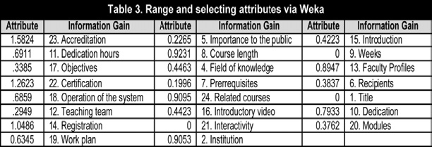 Se aplicaron también dos algoritmos propios de la minería de datos, que se detallan más adelante: uno, de clasificación para poder ver el impacto de las plataformas sobre los diseños instructivos y comunicativos subyacentes a los cursos; otro, de evaluación para conocer el grado de información que aporta la variable curso con independencia de la plataforma en la que se ubica.
