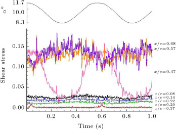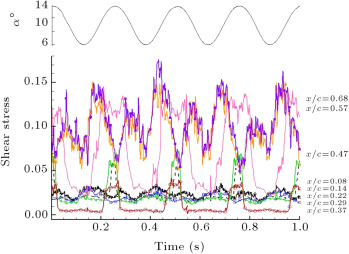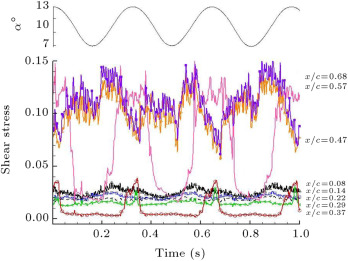 Variations of the quasi-wall-shear stresses calculated from the un-calibrated hot-film signals for an oscillation period of 1 s, are shown in Figure 6 . The corresponding equivalent angle of attack is shown on the top of each plot. On the right side of each trace, the positions of the hot-film sensors are indicated. For the lowest reduced frequency case, , the equivalent angle of attack varies from 8.3° to 11.7°, and for the highest one, , the angle of attack varies from 6° to 14°. It is seen that for all reduced frequencies, the quasi shear stress variations at locations of and 14% follow the variations of the equivalent angle of attack and their magnitudes are low. It represents laminar flow during entire oscillation cycles in this region. For (Figure 6 (a)), the laminar region is extended up to around 30% of the chord, . As the reduced frequency increases, the laminar flow region becomes restricted to the leading edge of the model. Furthermore, in this region, shear stress decreases toward the trailing edge, due to the thickening of the boundary layer. The shear stress at shows combinations of the laminar–turbulent flow (Figure 6 (a)). The values of shear stress vary from laminar to turbulent as the equivalent angle of attack increases during one oscillating cycle. As the equivalent angle of attack decreases, the flow becomes laminar. The flow at the last two channels, and 68%, is turbulent, since the magnitude of shear stress is higher than other channels (Figure 6 (a)).