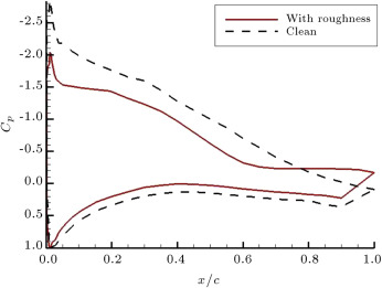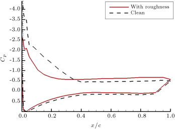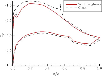 The effect of leading edge roughness on the pressure distribution around the airfoil is presented in Figure 9 . The results are shown for three different static angles of attack: 5°, 10°, and 18°. The data clearly shows that the flow transits as it passes over the roughness and becomes turbulent over the rest of the model. As indicated by an arrow in Figure 9 (a), at , the transition point moves from for the clean model to for the one with roughness. At higher angles of attack, it can be seen that the separated region over the model with roughness is more extensive than that of the clean one (Figure 9 (b) and (c)). Furthermore, the absolute value of the on the upper surface of the model with roughness is less than that of the clean one for all angles of attack, which results in a reduction in the lift value.