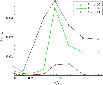 From Figure 8 , variation of the first mode of PSD along the chord is shown for all reduced frequencies. As seen, the onset of the unsteady boundary layer transition promotes to the leading edge with increasing reduced frequency. Furthermore, the amplitude of this mode, hence, the energy level of the boundary layer, increases with increasing the reduced frequency. This is attributed to the accelerated flow, pressure–gradient-lag and leading-edge jet effects in the unsteady motions.