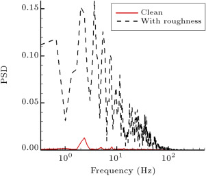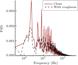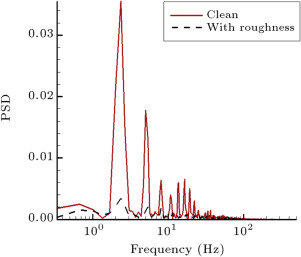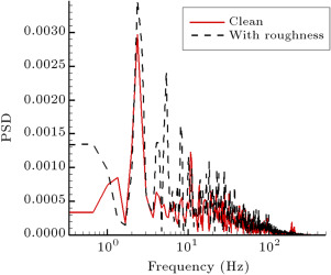 Figure 10 shows composite dynamic plots of the quasi-wall-shear stresses for the rough model, for and . It can be seen that there is no sign of laminar flow in any channels. Because the flow transits to turbulent as it passes over the roughness, even the hot-film signal for the channel located at shows turbulent flow during the entire oscillating cycle. The magnitude of the shear stresses, hence, the skin friction drag of the airfoil, increases in the rough model, with respect to the clean one. In contrast with the static case, toward the trailing edge, the turbulent boundary layer does not separate from the surface due to oscillation. Figure 11 compares the PSD of some hot film signals for both rough and clean models. For the locations near the leading edge (Figure 11 (a)), it is seen that the amplitudes of spikes for the rough case are higher than those of the clean cases. It is confirmed that the flow has become turbulent on these channels for the rough model, while it is still laminar for the clean one. The data for the channels located at and (Figure 11 (b) and (c)) reveal that for the clean model, the amplitudes of the spikes are amplified, with respect to the rough model, and the spikes have their maximum amplitudes at for the clean case. The reason for this phenomenon is the growth of boundary layer instability due to boundary layer transition. In the last channel (Figure 11 (d)), it is seen that the energy level of the boundary layer for the rough model is greater than for the clean one. This is due to the greater growth of the turbulent boundary layer in the rough case.