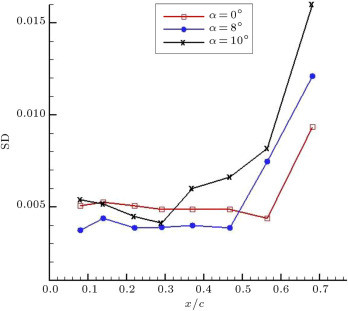 In the transition region, the disorder of the boundary layer is more than that of the other regions. The standard deviation of the hot-film signal is a suitable parameter to indicate the level of disorder. It will usually rise significantly as transition occurs and then fall to a lower state under fully turbulent conditions, but still well above the laminar level [12] , [26] and [27] . Figure 3 shows Standard Deviation (SD) of the hot film outputs for three static angles of attack, of 0°, 8° and 10°. It can be seen that at angle of attack of 0°, a sudden rise in the SD, which identifies the transition of the boundary layer to turbulent, is occurred for the last channel, . The region before this point, , shows a low level of SD, which represents the laminar boundary layer. This result can also be seen from the frequency domain analysis. For (Figure 4 (a)), the power spectral of the hot film outputs shows that the amplitudes of the spikes and the area beneath the PSD diagram, which means the growth in the energy level of the boundary layer, at , is higher than the previous locations. This clearly indicates that the boundary layer instability frequencies are present around this location, while, ahead of it, the flow is still laminar. From Figure 3 , it is seen that by increasing the angle of attack, the rise in SD moves upstream toward the leading edge. At , the first rise in SD occurs around and moves toward at an angle of attack of 10%. After these locations, the flow becomes turbulent and the SD data shows higher values. The power spectral of Figure 4 (b), for , shows that near the leading edge, at , the flow is still laminar. At , the level of the energy grows and boundary layer transition occurs. After this location, , the flow becomes turbulent and the spikes show high amplitudes. Variation of the averaged quasi skin friction coefficient with angle of attack is indicated in Figure 5 . The skin friction coefficient, , is defined as: