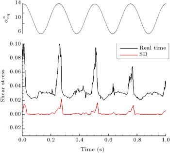 The location of transition can be better estimated from the local standard deviation variations. When the flow becomes turbulent, from the high fluctuations in the SD, the corresponding equivalent angle of attack can be detected. Figure 7 shows an example of the SD variations for the channel located at and for . From this figure, one can detect the flow transition over this hot-film location, , during the plunging motion. For example, it seems that the flow in the vicinity and over this hot-film is laminar for to , corresponding to , down to , and again up to . However, when the model reaches an angle of attack of , up to maximum and down to , transition occurs and the flow becomes turbulent. A similar process continues for another plunging cycle.