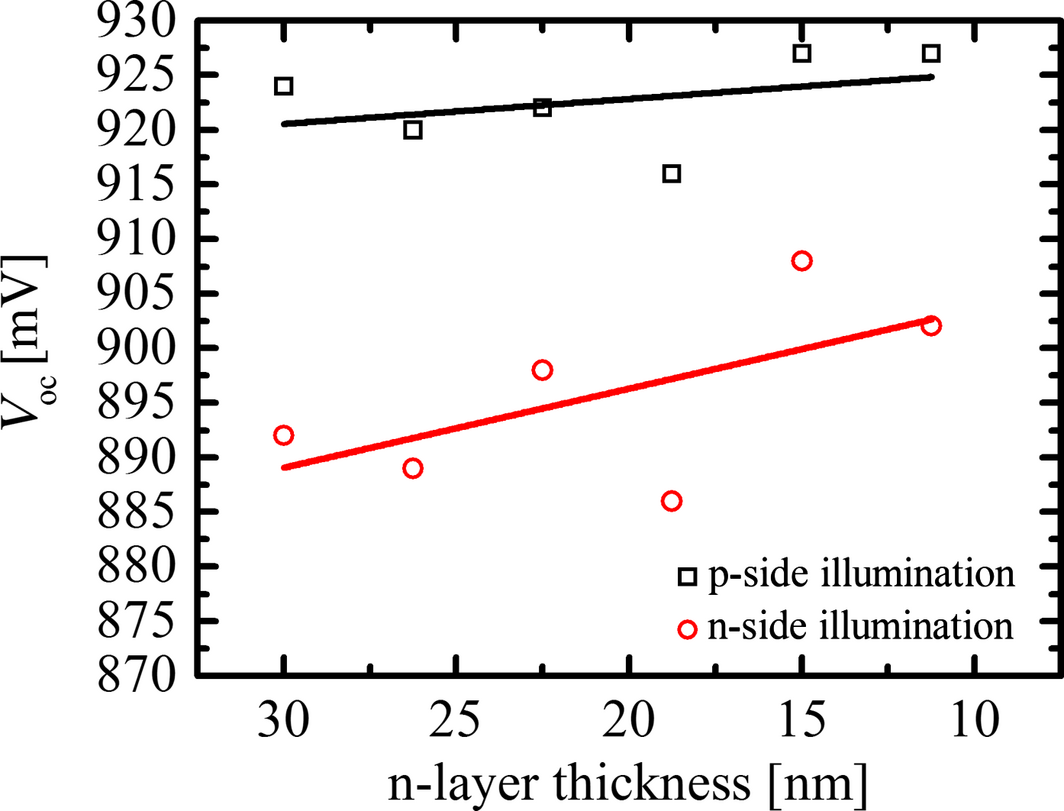 Figure 8. Open circuit voltage values of bifacial amorphous single-junction cells with decreased n-layer thickness. Lines are fits of the measurement points. |