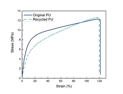 In order to assess the efficiency of bond reformation, tensile tests were carried out on the original and the recycled samples using an Instron 5967 testing machine equipped with a 500 N load cell. Rectangular samples ( 3 mm x 3 mm x 1.5 mm) were cut from the original thermoset polyurethane sheet and according to the DSC results, the samples were first heated to 160 °C for 3.5 hours, then rapidly cooled to 70 °C and kept at this temperature for 20 hours.