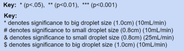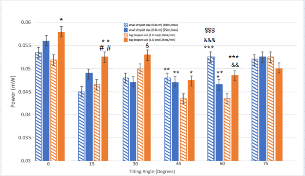 In figure 7, the graphs for the rain aspect are shown. These graphs provide information on how the piezoelectric strip was able to harness power with water droplets. Power output when piezoelectric strips were tilted at varying angles as well as exposed to varying flow rates (10mL/min and 25mL/min) was assessed. The variable flow pump setting was altered to 25 ml/min to test the effect of faster droplets on the power output due to the fact that piezoelectric strips generate power through vibrational energy. The 0-degree group produced the highest power output, and the big droplet size produced the most power at around 0.058 milliwatts. As seen by the symbols on the graph in figure 7, the big droplet size at 25ml/min was statistically significant, where p<.05, to the big droplet size at the 10ml/min setting at the 0-degree tilting angle. At the 75-degree tilting angle, there is no statistical significance between the groups because there was an inconsistent strain applied with the increase of the tilting angle of the strip.