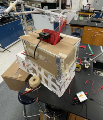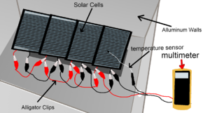 Figure 4: Experimental setup for the control group (aspect 1) - The sunlight simulator is propped up and the enclosed region is closed with aluminum foil on the inside of the box; alligator clips are used to connect all solar cells to the vernier energy sensor