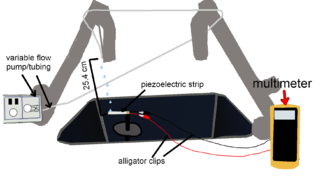 Another aspect of piezoelectric cells combined with solar cells was raindrop power generation. The conversion of rain into usable energy was another factor that was tested. A variable flow peristaltic pump was used with strips in intervals of 120 seconds and data was collected with a multimeter, as depicted in figure 3. An important variable that was considered in this procedure was varying drip rates. The variable pump that yields flow rates of 0.4 mL/min to 85 mL/min was used to account for the effect of the different rates. The test was conducted by attaching the pump tubing around a sink faucet to allow the water droplets to drip directly onto the piezoelectric strip (shown in figure 3) and the flow rate was changed for each trial multiple times from 10ml/min to 25ml/min. There were 18 trials conducted for each flow rate. The tilting angle of the solar cell was evaluated by the use of a rectangular base plate, much like the other variable conditions, to account for the energy difference when the model was put on different inclines.