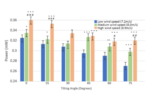In figure 8, the graph of the power output of the low wind speed trials is also shown. There is a general trend of the power output decreasing with the increase of tilting angles, as the 0-degree group produced the highest power, which is likely due to the fact that the strip was able to have a wider vibration when it was flat. The same trend followed through with the medium and high wind speed groups. The same y-axis scaling was used for all graphs for direct comparison. Overall, the high wind speed group at 0 degrees produced the highest power output. The piezoelectric strip produced 0.36 milliwatts, which is around 0.2 milliwatts more than the most optimal condition for the rain aspect. This is most likely due to the fact that the wind speeds were consistently vibrating the strip instead of water droplets dropping from a distance. The power output of the high wind speed (8.9m/s) was statistically significant to that of the medium (8.0m/s) and low (7.2m/s) wind speeds, where p<.001. Therefore, the highest wind speed allowed the strip to frequently oscillate, resulting in higher power output.