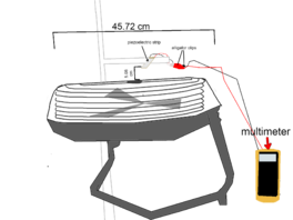 For the solar condition, the sunlight was provided by a sunlight simulator. The sunlight simulator (100 W Halogen bulb, Fuel Cell Store) was used for all trials and the distance from the solar cell was kept constant. This simulator provided light to the solar cell at a distance of 30.48 cm within the constructed chamber (previously stated in aspect 1). The light that was in the testing room independent of the experiment was accounted for in the conditions by minimizing it with an enclosed region. The test was simply conducted by parallelly connecting a piezoelectric strip to a multimeter. These strips were placed above the solar cell. Then, the light was left on for 600 seconds intervals in between trials of different numbers of piezoelectric cells to find the optimal current. The light that was in the testing room independent of the experiment was accounted for in the conditions by minimizing it with an enclosed region. Finally, the tilting angle of the solar cell was changed by the use of a rectangular base plate to account for the energy difference when the model was placed on different inclines.