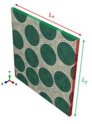 Los modelos numéricos basados en simulaciones micromecánicas mediante el Método de los Elementos Finitos (FEM) generalmente utilizan un elemento de volumen representativo (RVE) a nivel de capa que puede incluir una o varias fibras rodeadas por la matriz teniendo en cuenta las propiedades de ambos constituyentes y la posible decohesión de su interfaz. El RVE representa la microestructura de un material heterogéneo de forma que pueda ser considerado estadísticamente heterogéneo a nivel macroscópico [14], esto es, es el mínimo volumen necesario para capturar el comportamiento a microescala de un punto material. En literatura se pueden encontrar diferentes enfoques de RVE [15-20] en los que se varían la geometría, de forma que se modelan una o varias fibras, y se imponen diferentes tipos de condiciones de contorno en las superficies laterales. Dentro de estos enfoques, destaca el uso de RVEs geométricamente periódicos sometidos a condiciones de contorno periódicas (PBCs). Estas PBCs se implementan como ecuaciones que relacionan el desplazamiento entre nodos en las caras opuestas del RVE, de tal forma que se produzca una deformación periódica del elemento, lo que se define en la ecuación 1.