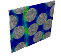 Para llevar a cabo estos estudios, en el trabajo actual se emplea el software de simulación ABAQUS/Standard 2021 empleando la definición de PBCs sobre un RVE periódico, apoyándose de la capacidad de realizar estudios paramétricos mediante ABAQUS Scripting. Se analizarán en primer lugar los parámetros geométricos que puedan tener efecto sobre el resultado homogeneizado. Posteriormente, se emplearán modelos de daño progresivo (PDM), deformación permanente de la matriz polimérica, y modelos de separación de la interfaz fibra-matriz para recoger convenientemente la propagación de daños en diferentes modos. La Figura 3 recoge el resultado de un estudio preliminar, donde se observa la elevada deformación angular permanente que puede producirse en la matriz polimérica ante estados de carga como los mencionados anteriormente. Se observa como la deformación permanente se acumula principalmente en las zonas de resina comprendidas entre fibras cercanas (en color gris en la Figura 3).