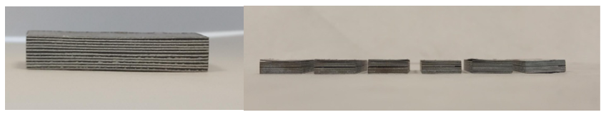 Una vez fabricados los laminados de cribado, se observó que las combinaciones P1,P2,P3,P4,P6 y P7 no soportaron el mecanizado de las probetas de ILSS por corte por chorro de agua, el cual les causaría delaminaciones ejemplificadas en la figura 6. Este fenómeno indica la debilidad de las uniones entre materiales o la presencia de delaminaciones preexistentes al corte, las cuales se vieron amplificadas por la incidencia del agua a presión. Por este motivo, estas combinaciones fueron descartadas de manera inmediata.