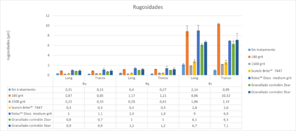 Los tratamientos superficiales no solo eliminan óxidos superficiales, sino que también genera un aumento de la superficie de contacto y rugosidades derivando en un mejor anclaje físico. Por lo tanto, el análisis superficial posterior al tratamiento tiene gran importancia en este tipo de componentes.Los parámetros analizados, recogidos en la figura 3, para los acabados superficiales de los materiales definidos son: