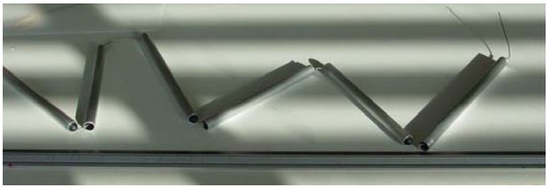 In spite of the considerations previously made, buckling can happen in cylindrical Tensairity beams even if the cables, strut and air pressure are well designed. The formulation for buckling-free bending is based on a design in which the cables lie on the opposite site of the airbeam with respect to the strut. In cylindrical beams, this is true in their central parts but, as the cable approaches the supports, the spiral goes up and therefore both strut and cable lie above the neutral axis of the beam (Figure 9). As a consequence, the membrane pulls the strut downwards and buckling can happen in the extremes of the beam [16].