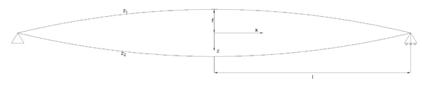 One way to avoid this is by setting the neutral axis at the same height of the supports. Alternatively, one can define a curve neutral axis that goes up as the cable does, maintaining symmetry between the strut and the cable at every section with respect to the axis. These solutions are called respectively symmetric and asymmetric spindle. A simple scheme of a symmetric spindle is shown in Figure 11.| Figure 11: Symmetric spindle-shaped beam |
