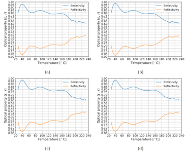 For measuring the thermal-optical properties, some researchers measure the irradiance of the composite material at the temperature, as presented by [11], and then, calibrate the heat source to emit power at such wavelength. This approach represents a problem when the process requires to constantly reinitialize to lay down a new layer, increasing the uncertainty of the obtained results and deviations with respect to measurements.