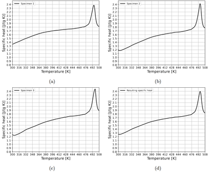 The specific heat measurements are performed according to the ASTM E 1269 – 01 standard test, using a Differential Scanning Calorimeter Q200 from TA Instruments. The tests are performed with a temperature rate of 20 ºC/min.