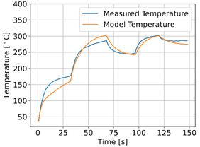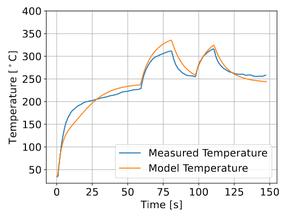 Once the experimental results have been obtained, they are compiled into a lookup table, where each property can be obtained or interpolated to provide the required information to the process Digital Twin. That data is then used to simulate the real process. The input variables for the simulation are gathered from the real machine and imposing random changes to the power delivered to the heating element. The results obtained from the real process are compared with the simulation made by the process Digital Twin. Figure 9 compare the results of two production processes. The Digital Twin is capable of replicate the process due to the thermal characterization of the composite material. Some fine adjustments were made only to the mathematical correlations of the heat transfer phenomena due to convection, leaving the thermal properties as measured using the in-house procedures described above, as the convective phenomena description comes from empirical correlations.