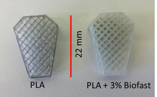 El presente estudio confirma la viabilidad para la fabricación de un nuevo filamento en base a PLA & Biofast (biocerámica de origen marino) y su utilización para impresión 3D-FDM. Los análisis demuestran que las partículas biocerámicas se encuentran distribuidas uniformemente en la matriz del polímero y su incorporación puede ser controlada en función de la mezcla seleccionada. En cuanto a la estructura cristalina y de enlaces, los procesos de fabricación no originan modificaciones que puedan afectar la biocompatibilidad del dispositivo final. Así, estos nuevos filamentos se muestran como potenciales candidatos para su aplicación en ingeniería biomédica.