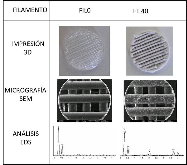 En la Figura 4 se presentan, a modo de ejemplo, las imágenes ópticas, micrografías SEM y análisis EDS para los andamiajes porosos fabricados con las composiciones extremas de la serie. Como podemos observar la incorporación de la biocerámica origina una modificación del acabado del andamio, presentando una morfología superficial más rugosa. La presencia de la biocerámica también queda evidenciada en los análisis EDS al detectar claramente la señal de Ca y P en el andamio producido con el hilo FIL40.