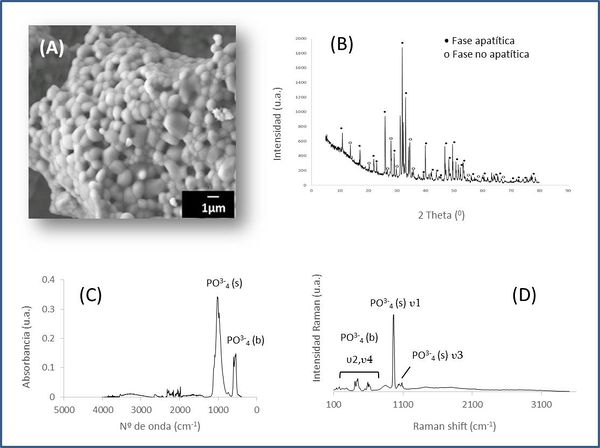 La biocerámica de origen marino, Biofast, es obtenida a partir de la revalorización de los dientes de tiburón de la especie Prionace Glauca. Este proceso consiste en tres fases básicas: (1) molienda, (2) tamizado y (3) pirolización [5,6]. En la Figura 1 se muestran resultados del análisis fisicoquímico de esta biocerámica. La micrografía de electrones secundarios (Figura 1-A) permite observar su estructura globular y porosa. En cuanto a su estructura cristalina, el patrón de difracción de rayos X (Figura 1-B) confirma que se trata de un material cristalino bifásico, formado por un 63% de fase apatítica (hidroxiapatita/fluorapatita) y un 37% de fase no apatítica (β-TCP /whitlockite) [5,6]. En cuanto a su estructura de enlaces analizada por espectroscopía IR y Raman (Figura 1-C y D) respectivamente, podemos comprobar la presencia de las bandas asociadas a los grupos fosfato (PO43-), en modo de tensión (s) 930–1100 cm-1 y de flexión (b) 400–600 cm-1, típicas de biocerámicas basadas en fosfatos cálcicos.