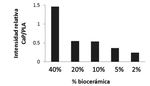 La caracterización mediante espectroscopía Raman vuelve a corroborar este resultado, pudiéndose identificar las bandas características del PLA. A medida que incorporamos más porcentaje de biocerámica a la mezcla más se detecta la presencia de las correspondientes a los grupos PO43-. A partir de estos espectros se realizó un análisis cuantitativo de la intensidad para dos bandas Raman (970 cm-1 y 862 cm-1) con el objeto de calcular la razón I Biofast 970 cm-1 / IPLA 862 cm-1. Los resultados se muestran en la Figura 6 y como podemos observar esta ratio aumenta a medida que el porcentaje de biocerámica incorporado en el filamento se incrementa.