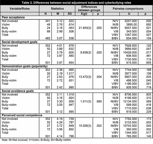 The Kruskal-Wallis H test showed statistically significant differences between the different cyberbullying roles in all the social adjustment variables (table 2). Post hoc analyses with pairwise comparisons using the Mann-Whitney U test showed that cybervictims were less accepted by their peers compared to those not involved in cyberbullying (p?.001), cyberbullies (p?.01) and cyberbully-victims (p=.027), while cyberbully-victims showed less peer acceptance than those not involved in cyberbullying (p=.021). As regards social development goals, those not involved showed a higher level of social competence compared to the cyberbullies (p=.047) and the cyberbully-victims (p=.017). In terms of social demonstration goals, cybervictims displayed fewer popularity goals than cyberbullies (p=.045) and cyberbully-victims (p?.001). However, the group not involved in cyberbullying exhibited fewer popularity goals than the cyberbully-victims (p?.01). As for self-perceived social competence, the group of cyberbullies showed lower levels than those not involved (p?.01) and cybervictims (p?.01). Moreover, cyberbully-victims showed lower self-perceived social competence compared with the cybervictims (p=.017) and those not involved (p=.040).
