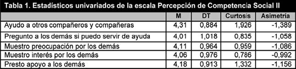 Los resultados del AFC de la escala de percepción de competencia social para adolescentes fueron óptimos (figura 1), ?2S-B =13.96; p=.01; NNFI=.971; CFI=.985; RMSEA=.059; SRMR=.27. Los valores de las covarianzas entre los ítems oscilaron entre .46 y .71 El valor del coeficiente de Mardia multivariado fue de 30.63. En la tabla 1 (en la página siguiente) se presentan los estadísticos univariados de cada ítem.
