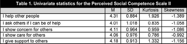 La autopercepción de la competencia social fue medida con la escala Perceived Social Competence Scale II (Anderson-Butcher, Amorose, Riley, Gibson, & Ruch, 2014). Dicha escala valora la percepción de la propia competencia social a través de cinco ítems (ej. «Muestro preocupación por los demás» o «Presto apoyo a los demás») y siguiendo una escala tipo Likert con cinco opciones de respuesta (1=totalmente falso y 5=totalmente verdadero). No existen estudios que hayan utilizado esta escala con adolescentes españoles. Los resultados de la validación de su adaptación al español se presentan en el apartado de resultados. La consistencia interna con la muestra de estudio fue adecuada (?=.91).