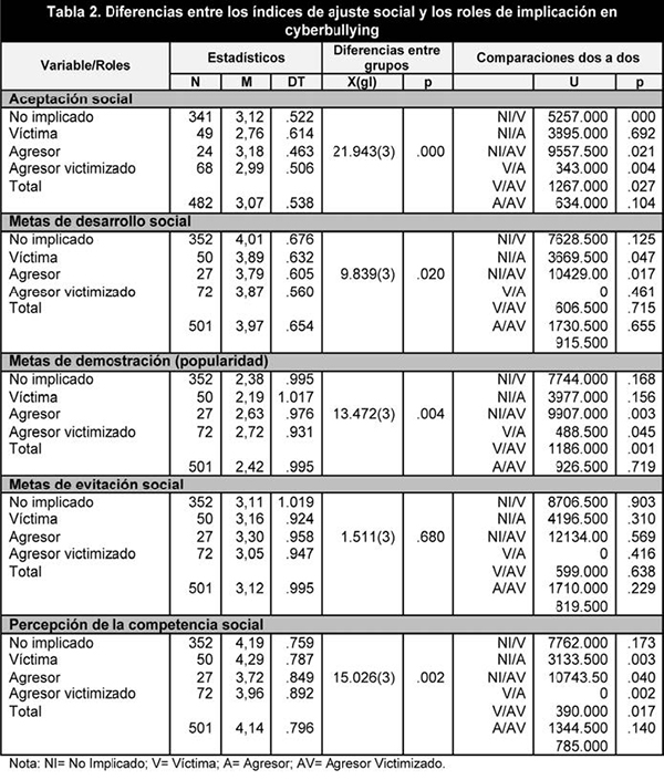 El test H de Kruskal Wallis indicó diferencias estadísticamente significativas en todas las variables de ajuste social entre los distintos roles de la dinámica cyberbullying (tabla 2). Los análisis post hoc con comparaciones dos a dos mediante la prueba U de Mann-Whitney mostraron que las cibervíctimas fueron menos aceptadas socialmente cuando se compararon con el grupo de los no implicados (p?.001), los ciberagresores (p?.01) y los ciberagresores victimizados (p=.027), mientras que los ciberagresores victimizados fueron menos aceptados socialmente comparados con los no implicados (p=.021). En las metas de desarrollo social fueron los no implicados los que mostraron mayores niveles comparados con los ciberagresores (p=.047) y los ciberagresores victimizados (p=.017). En las metas de demostración social, fueron las cibervíctimas las que menos siguieron objetivos de popularidad comparadas con los ciberagresores (p= .045) y los ciberagresores victimizados (p?.001). Sin embargo el grupo de los no implicados mostró menos objetivos de popularidad comparados con los ciberagresores victimizados (p?.01). En cuanto a la autopercepción de la competencia social, el grupo de los ciberagresores mostraron menores niveles que los no implicados (p?.01) y las cibervíctimas (p?.01). Los ciberagresores victimizados mostraron una menor autopercepción de su competencia social comparados con las cibervíctimas (p=.017) y los no implicados (p=.040).