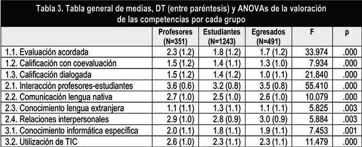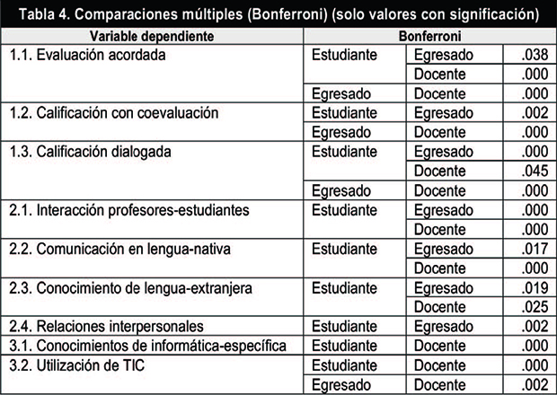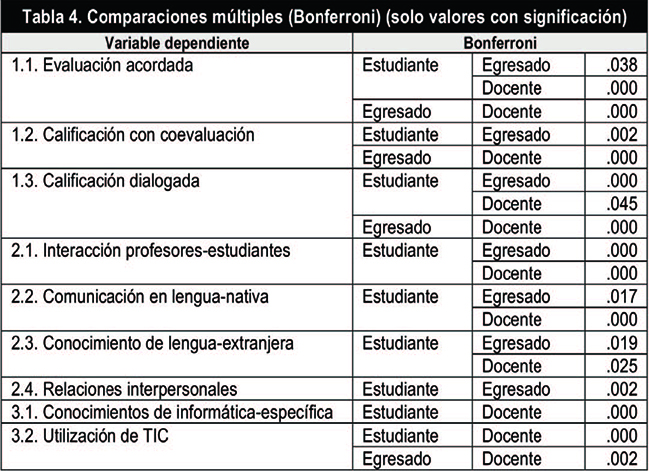 Del análisis de la varianza en cada uno de los ítems, se constató que existían diferencias significativas entre profesores, estudiantes y egresados (Tabla 3).