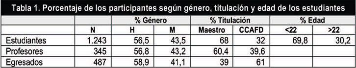 Se tomó una muestra incidental, no probabilística, compuesta por 24 universidades españolas (Alcalá de Henares, Almería, Autónoma de Barcelona, Autónoma de Madrid, Barcelona, Burgos, Castilla la Mancha, Granada, Huelva, La Coruña, León, Lleida, Murcia, País Vasco, Ramón Llul, Salamanca, Cantabria, Sevilla, Tenerife, UCAM, Valencia, Valladolid, Vic y Zaragoza), de la mayoría las comunidades autónomas, con los siguientes requisitos: a) Profesores universitarios de formación inicial en Maestro o de CCAFD que hubieran impartido docencia en esa titulación en alguno de los cuatro cursos precedentes; b) Estudiantes de cuarto curso en el 2014-2015; c) Egresados de los cinco últimos cursos de los mencionados títulos (Tabla 1).