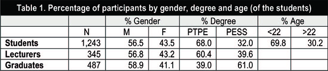 The definition of the sample and the application of the questionnaire were undertaken in April 2015. Students and lecturers were given questionnaires in paper format, and graduates were given electronic questionnaire (Google), given the difficulty in accessing this group. The approximate duration for completion was forty minutes. Anonymity was guaranteed by coding the completed questionnaires.