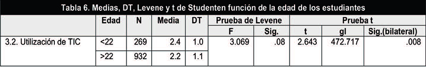 Para el caso de las diferencias entre estudiantes en función de la edad se aplicó la prueba t de Student para dos muestras independientes. La prueba de Levene arrojó un valor inferior a .05 por lo que se asumieron varianzas diferentes. Los resultados mostraron diferencias significativas entre los grupos tan solo en el ítem «Utilización de las TIC», siendo superiores los valores de los más jóvenes (Tabla 6).