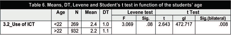 In the case of differences between students as a function of age, the Student's t-test was applied to two independent samples. The Levene test yielded a value lower than .05 so different variances were assumed. The results showed significant differences between the groups only in the item �Use of ICT�, with the younger students producing higher values (Table 6).
