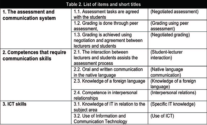 The final version of the questionnaire consisted of 12 questions and 79 separate items. Questions were asked to identify: a) to what extent the courses studied helped to develop teaching competences; and b) the degree to which participants agreed with statements related to the development of the subject areas. The evaluation was undertaken using a Likert scale with five points of agreement: between 0 (none, nothing) and 4 (a lot, very high). The present paper focuses on the items related to: a) the assessment and communication system; b) competences that require communication skills; and c) competences in the area of ICT.