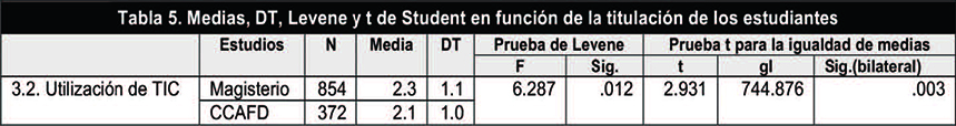 Se realizó un segundo estudio profundizando en el «Dominio de las TIC» entre los estudiantes en función del género, edad y titulación cursada (Magisterio vs CCAFD). Tras aplicar la prueba t de Student para dos muestras independientes, no se obtuvieron diferencias significativas ni en el género ni en la edad. Para el caso de la titulación, se aplicó la t de Student. La prueba de Levene arrojó un valor inferior a .05 por lo que se asumieron varianzas diferentes. Se encontraron diferencias significativas (p=.003) entre los estudiantes de Magisterio y los de CCAFD siendo superiores los valores de los primeros (Tabla 5).