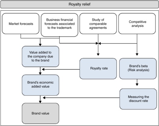 The royalty relief, as detailed in the following image (Fig. 1) consists first of a long run estimation of the company’ sales. Second, it is necessary to determine the royalty rate which would correspond to that sales forecast from market databases. Then this rate would be multiplied by the forecast sales and so we find the cash flow corresponding to the brand. Third, it is necessary to determine a proper discount rate which must include the risk associated with the valued asset and, finally, it would suffice to update the cash flows and find the sum of the updated assets whose result would correspond to the brands value.