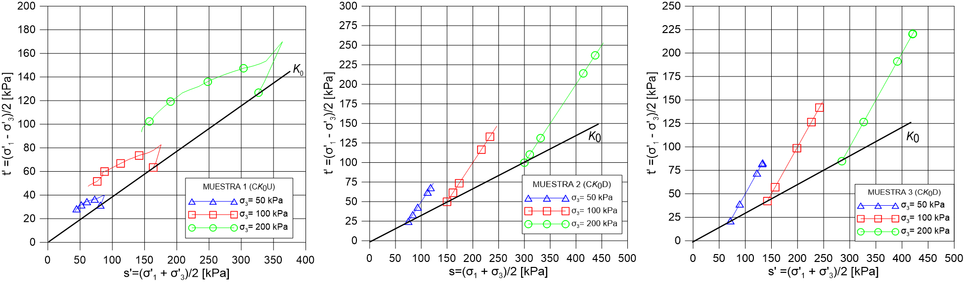 | Figura 11. Trayectoria de esfuerzo tipo MIT. Muestra 1 - (izq.). Muestra 2 - (cent.). Muestra 3 - (der.) |