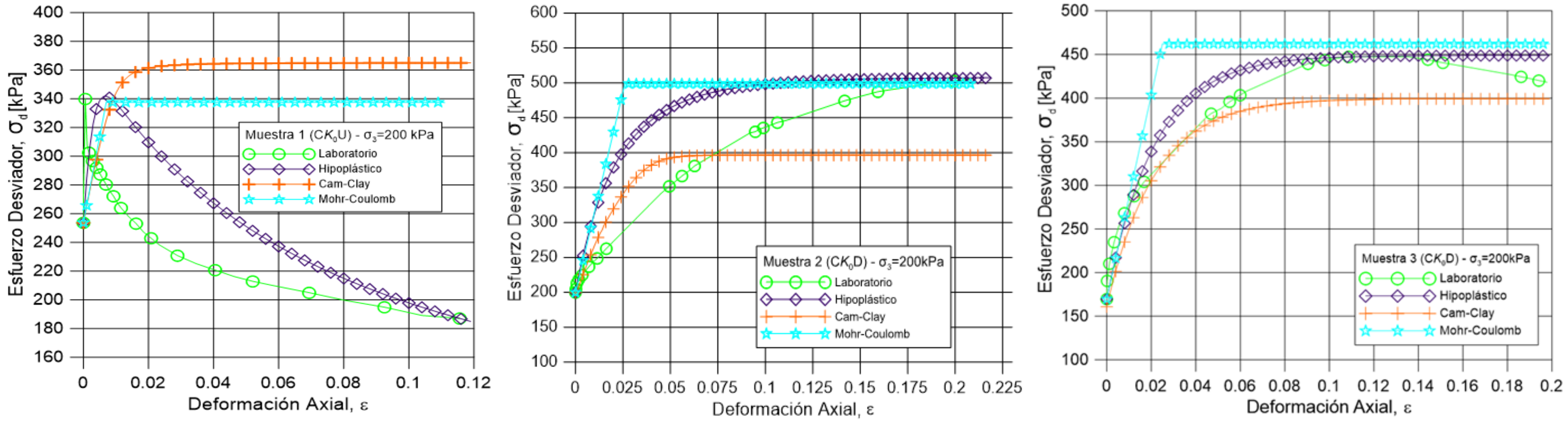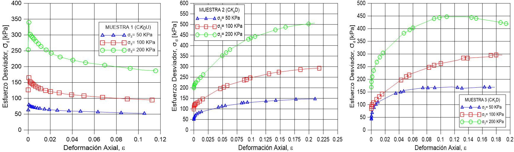 | Figura 15. Comportamiento esfuerzo-deformación axial bajo 200 kPa de confinamiento. Muestra 1 (izq.). Muestra 2 (cent.). Muestra 3 (der.) |