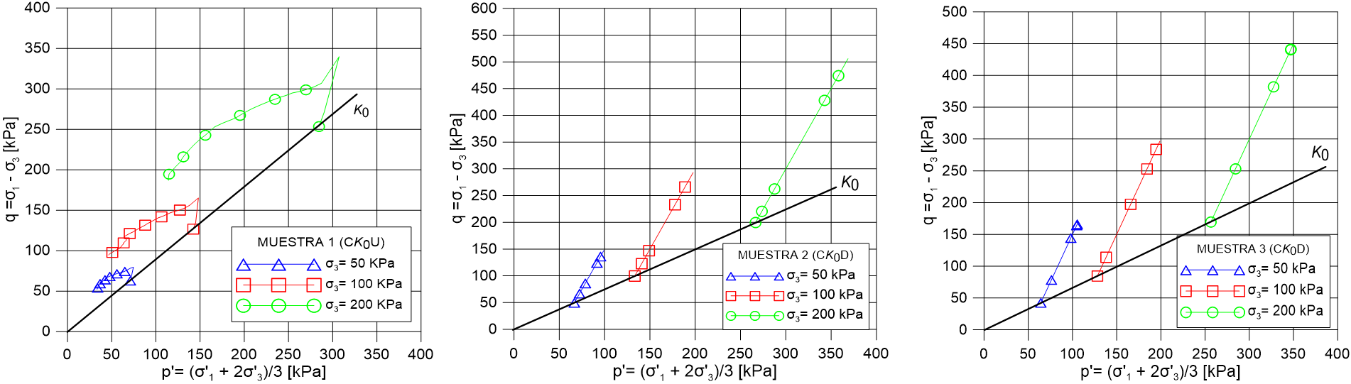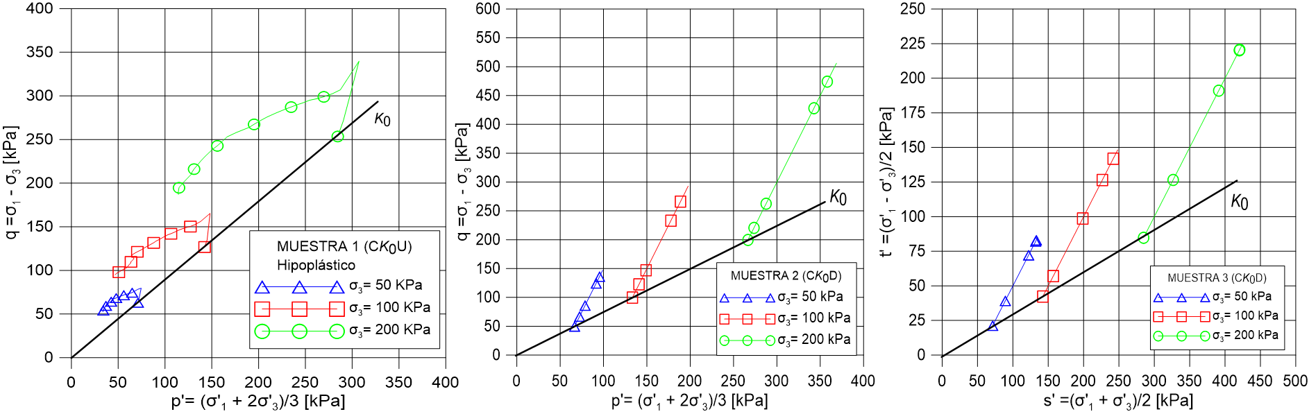 | Figura 10. Trayectoria de esfuerzo tipo Cambridge. Muestra 1 - (izq.). Muestra 2 - (cent.). Muestra 3 - (der) |