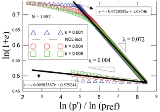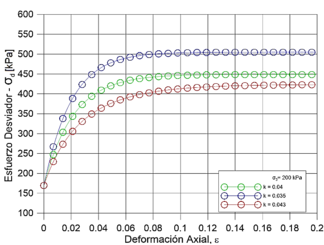 Por otra parte, la respuesta plástica se puede obtener utilizando los parámetros y . Dichos parámetros representan la pendiente de la línea de estado crítico (LEC) y la pendiente de la línea de consolidación normal (LCN). Por esta razón es necesario desarrollar pruebas oedométricas y triaxiales, simultáneas, para obtener dichos parámetros. No obstante, los parámetros para las primeras iteraciones del modelo Cam-Clay se recopilaron a partir de los resultados obtenidos durante plan experimental () a través de LEC y la calibración del modelo Mohr- Coulomb () mediante la siguiente ecuación