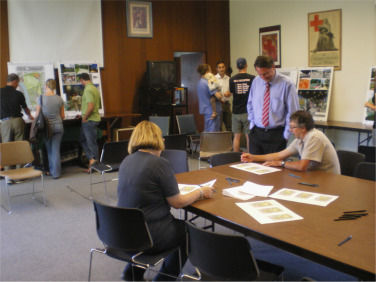 In the RFP, both the Medford Urban Renewal Board and the City Council expressed the intent to engage the community in the consensus-building process through three public meetings and community design charrettes. Although the number and content of the meetings were set by the guidelines of the RFP, the city provided leeway to the design team to decide on the logistics. The first meeting was held on April 16, 2012 to introduce the members of the design team to local business owners, park employees, and residents. The designers asked the residents about their perceptions of safety, attachment to park features, goals, and the desired programmatic elements. During the first meeting, the design team set up three “stations,” with each station focusing on the performance of a specific task in the participatory process (Figure 2 ).