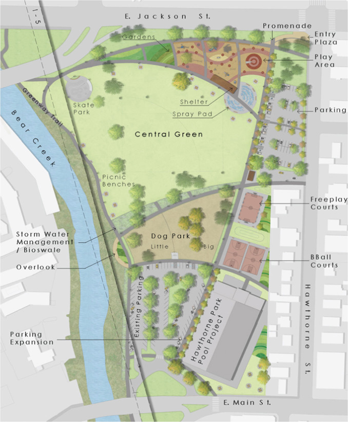 Similar to many public landscape architectural projects, redesigning Hawthorne Park required the collaboration of various professionals (Webber and Khademian, 2008 ). The design team assembled by the city included a landscape architecture company, an architecture group, a planning group, and an environmental service company. The author was a key project facilitator, and the Medford City Council, the Urban Renewal Board, and the local residents were the main stakeholders. Deliverables for the Medford Parks and Recreation Department included schematic plans, 3D models, renderings of the proposal, and a final report, which would assist the department in guiding future redevelopment.
