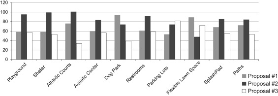 A total of 203 survey entries were collected. The kit-of-parts exercise indicated strong preferences for the programmatic elements featured in each alternative proposal presented in the traditional workshops and provided a nuanced understanding of the differences in the evaluation of each design solution of the residents (Figure 7 ). For example, the survey entries indicated that the play area was the best plan in Proposal #2, whereas the dog park was preferred in Proposal #1. These findings were pivotal elements in shaping the final design of Hawthorne Park.
