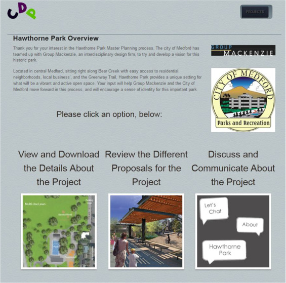 The CDP interface was a flexible, web-based support tool that was developed to create an effective community-based redesigning of Medford’s Hawthorne Park. The web-page was organized around three components. Each component replicated the face-to-face activities from the second public meeting in digital format. CDP was advertised to the community via local news channels, email flyers sent to the listservs of the Parks and Recreation Department, and a listing in the local newspaper. CDP users could access the digital platform through the website: www.communitydesignproject.org .