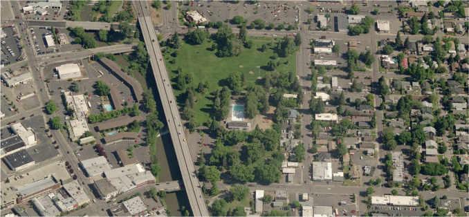 Figure 1. Bird’s eye view of Hawthorne Park showing its proximity to downtown Medford and the dominance of the freeway (Image courtesy of Bing Maps). |