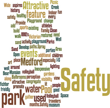 The first station had a map of the existing Hawthorne Park. Participants placed stickers on the map to point out areas that required improvement and those valued as community assets. The designers recorded the feedback and made it available online. The second station solicited the hopes and goals of the residents for the future of the park. Keywords that described their perceptions were recorded and later analyzed using www.tagxedo.com, an online text analysis tool that would output results in word clouds (Figure 3 ).