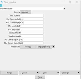 Inlet boundary conditions (i.e., wood rate or flux: number of logs entering the simulation; Fig.6) can be assigned to the simulation domain boundaries (as many as needed), specifying a number of wood pieces per minute and their main characteristics (i.e., size and density). If more than one wood inlet is added, they should be numbered (e.g., Inlet number: 1, 2, 3…., n).